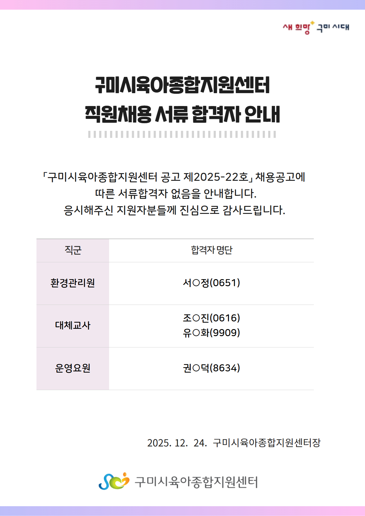 | [구미시육아종합지원센터 공고 제2025-22호] 구미시육아종합지원센터 직원(환경관리원, 대체교사, 운영요원 ) 최종합격자 발표 | |||