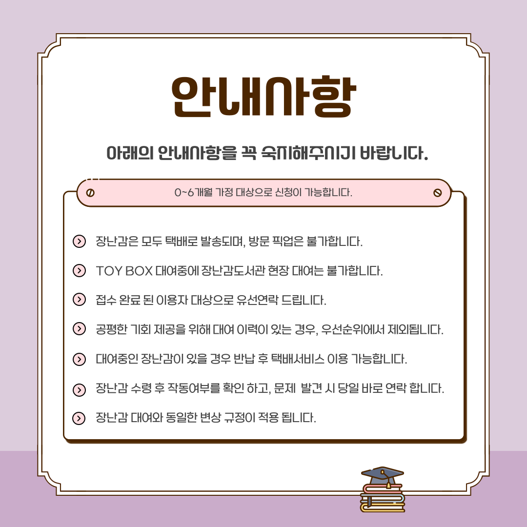 유의사항◆ 택배 발송일: 12/15(월) ◆ 신청 완료 된 이용자 대상으로 개별 연락 드립니다. ◆ 회원정보에서 주소를 꼭!!! 확인해주세요. ◆ 장난감은 모두 택배로 발송되며, 방문픽업은 불가합니다. ◆ 문의 사항은 아래 번호로 전화 주시기 바랍니다. ☎ 054) 474-2017 (내선번호 2) |