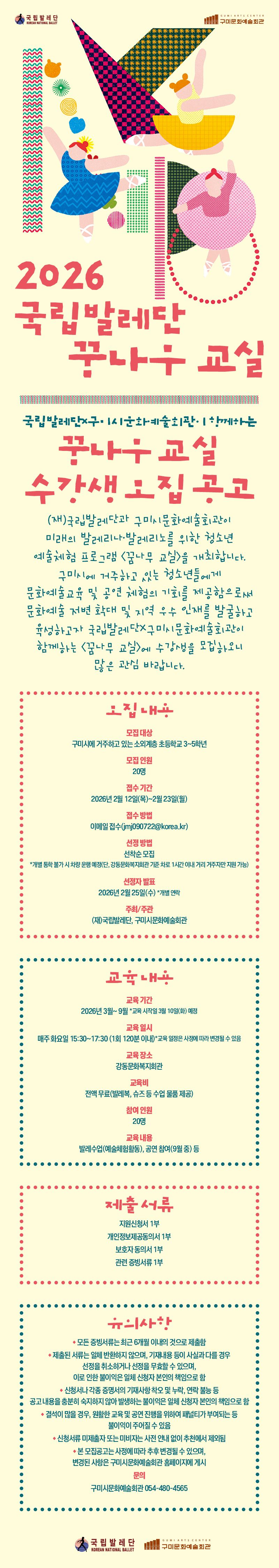 안녕하십니까? 구미시육아종합지원센터입니다. [문화예술회관-1174 (2026.02.12)] 호에 의거하여 '국립발레단과 함께하는 꿈나무 교실 홍보' 게재합니다. 많은 관심과 참여 부탁드립니다. 감사합니다.