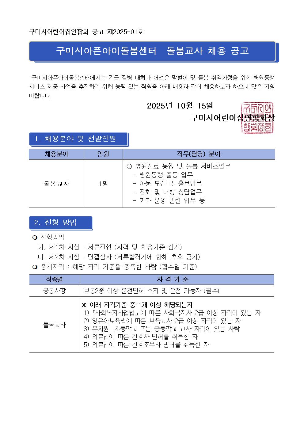 [구미시어린이집연합회 공고 제2025-01호] 구미시아픈아이돌봄센터 돌봄교사 채용공고 | |||