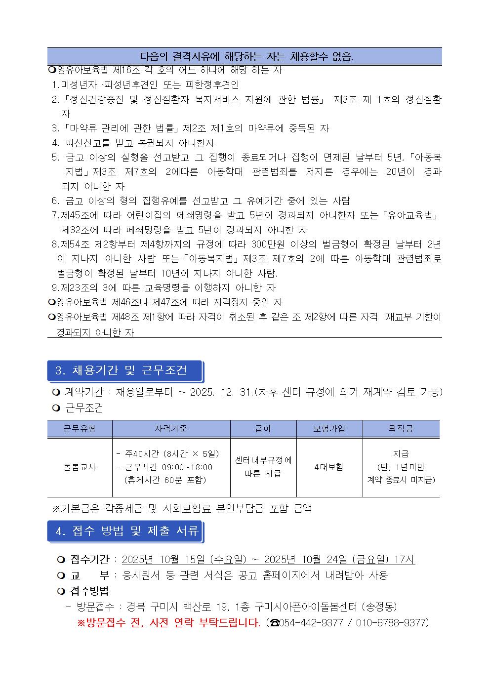 첨부#1 | 구미시 아픈아이 돌봄센터 채용공고 2025-01호.pdf [용량:93.3KB] | ||