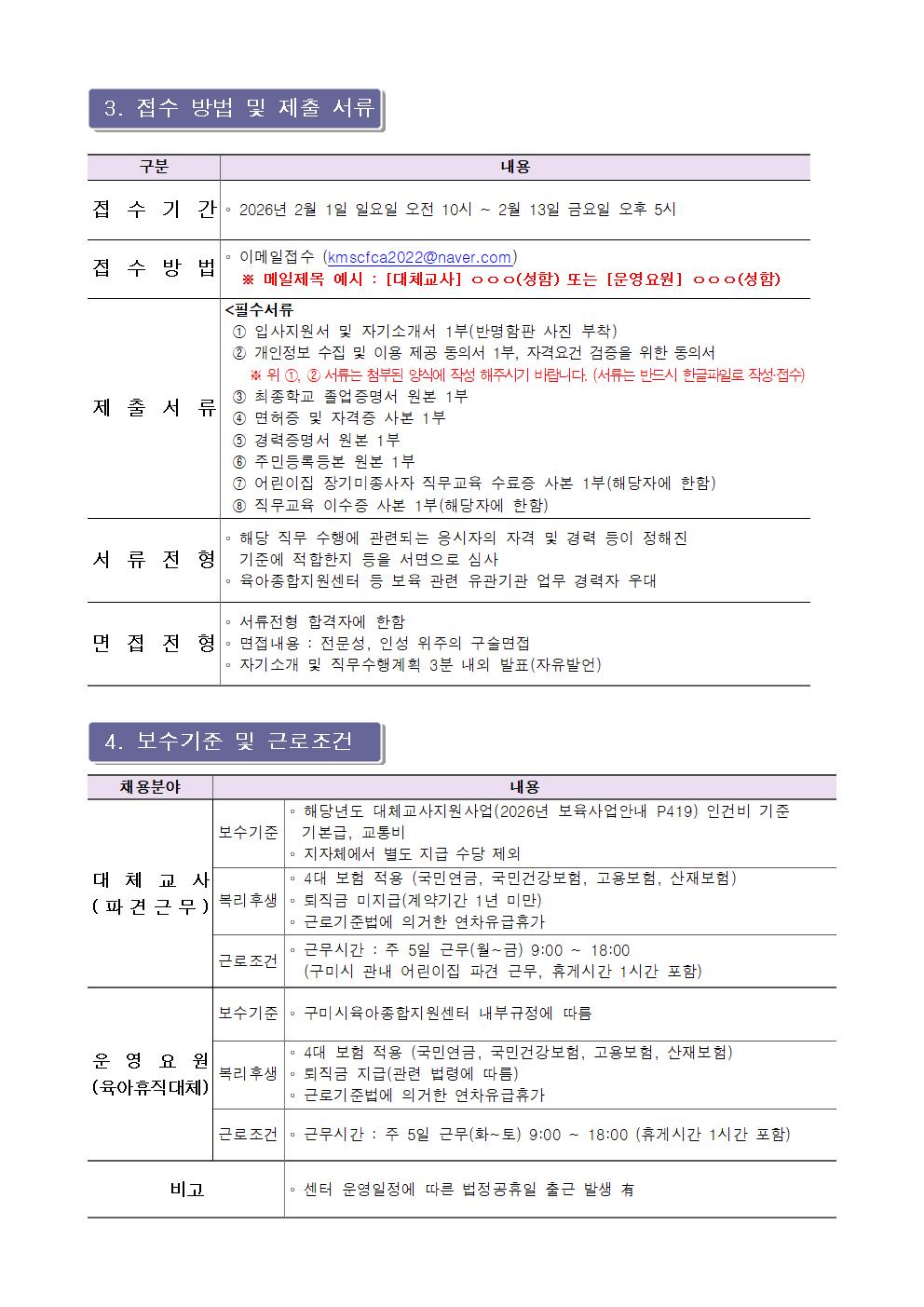 | [구미시육아종합지원센터 공고 제2026-04호] 구미시육아종합지원센터 직원(대체교사, 운영요원) 채용공고 | |||