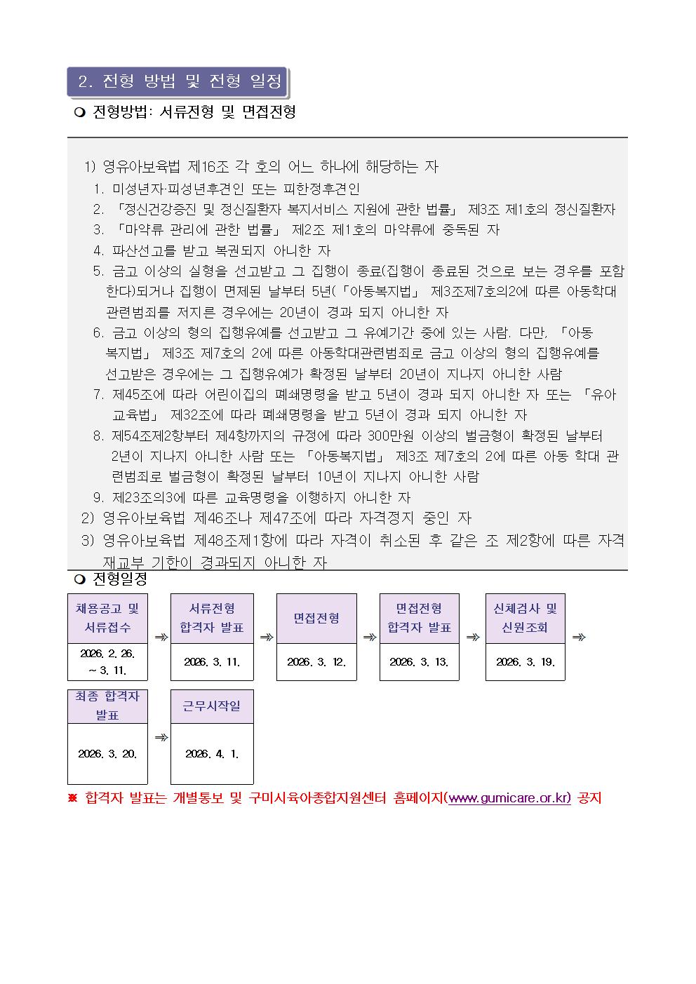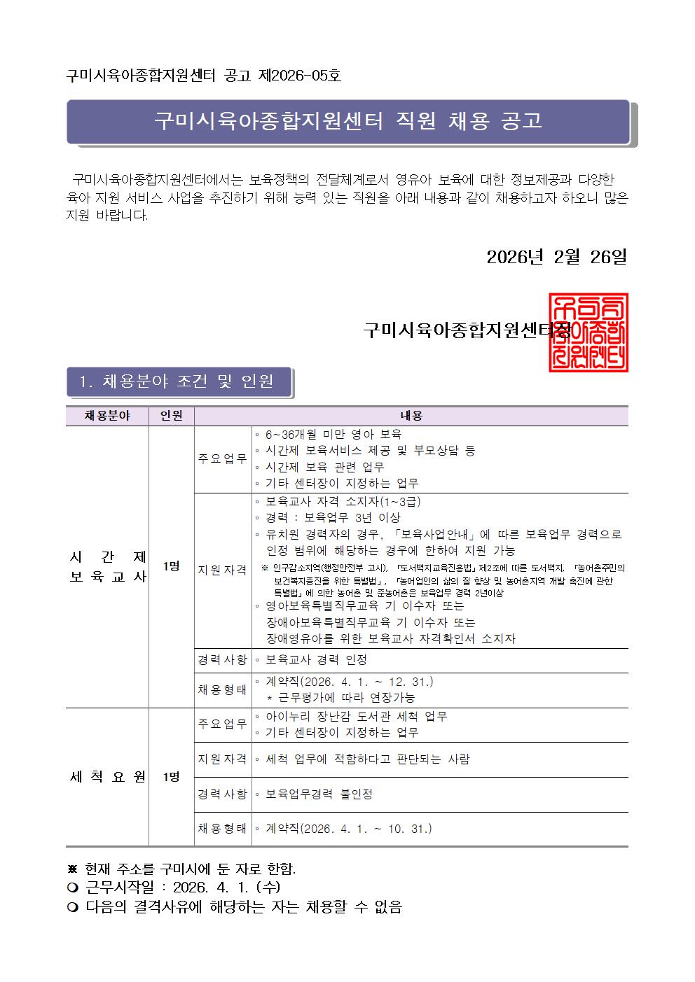 | [구미시육아종합지원센터 공고 제2026-05호] 구미시육아종합지원센터 직원(시간제 보육교사, 세척요원) 채용공고 | |||
