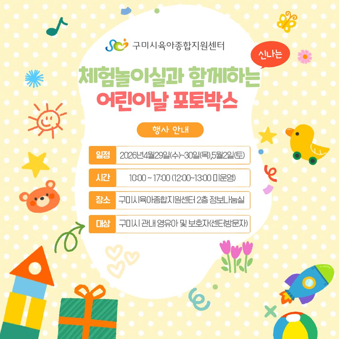 [체험놀이실] 어린이날 포토박스 이벤트 일자 : 4월 29일(수), 4월 30일(목), 5월 2일(토) 시간 : 10:00 ~ 17:00 까지 (12:00 ~ 13:00 미운영) 장소 : 2층 정보나눔실 앞 영유아체험놀이실에서 즐겁고 신나게 놀이하고 어린이날 기념 포토박스에서 가족,지인,친구와 함께 사진을 찍고 소중한 추억을 남겨보세요 ~ ♥ * 구미시 관내 영유아 및 보호자(센터방문자) 대상* * 참여자 명단 작성 및 만족도 조사 참여 시 이용이 가능합니다. * 개인회원 및 기관회원도 참여 가능합니다. *5월 1일(금) 근로자의 날 / 5월 5일(화) 어린이날 센터 휴관으로 인해 어린이날 포토박스 이벤트가 앞 당겨 진행되는 점 양해부탁드립니다. ☎ 영유아체험놀이실 문의 054)474-2017(내선1)