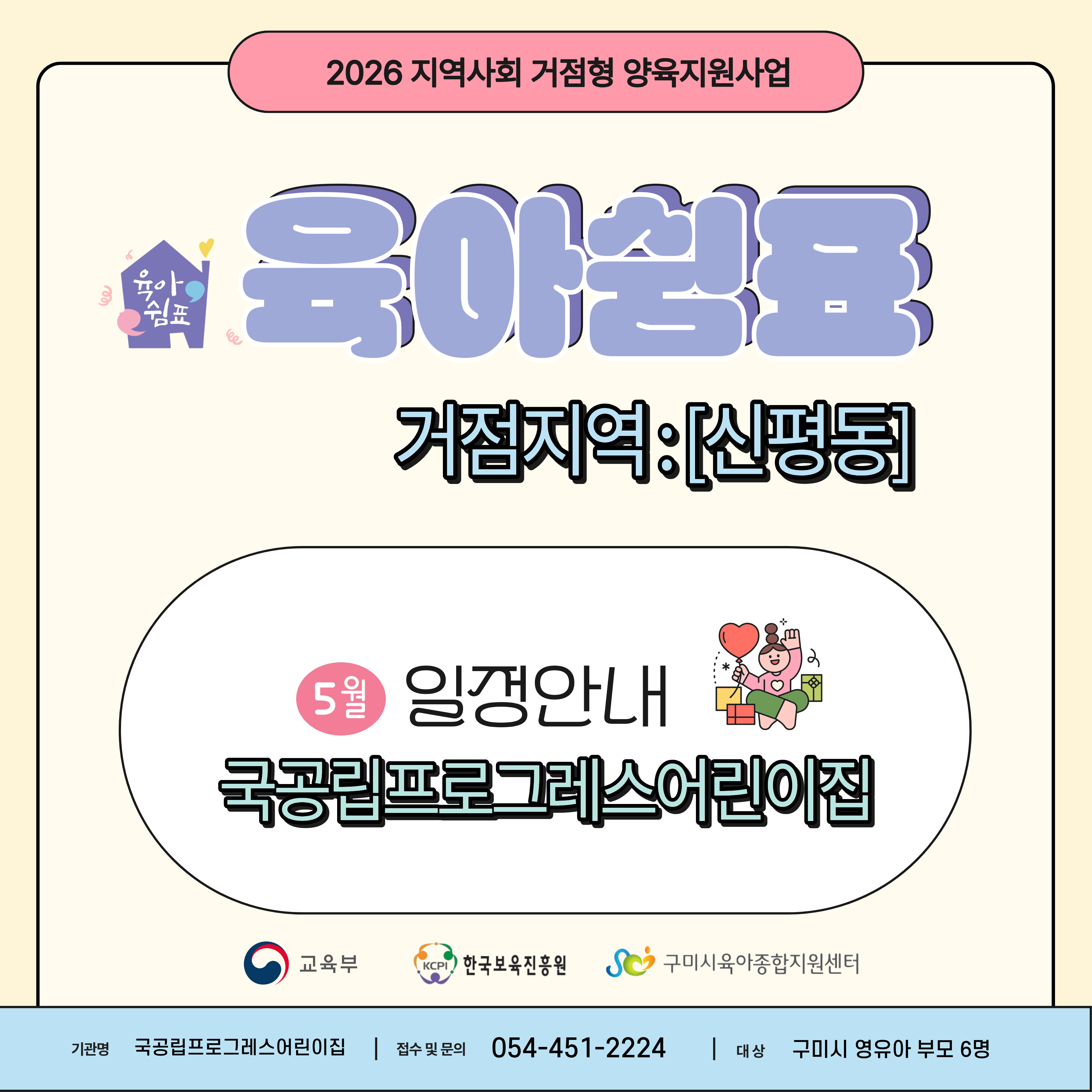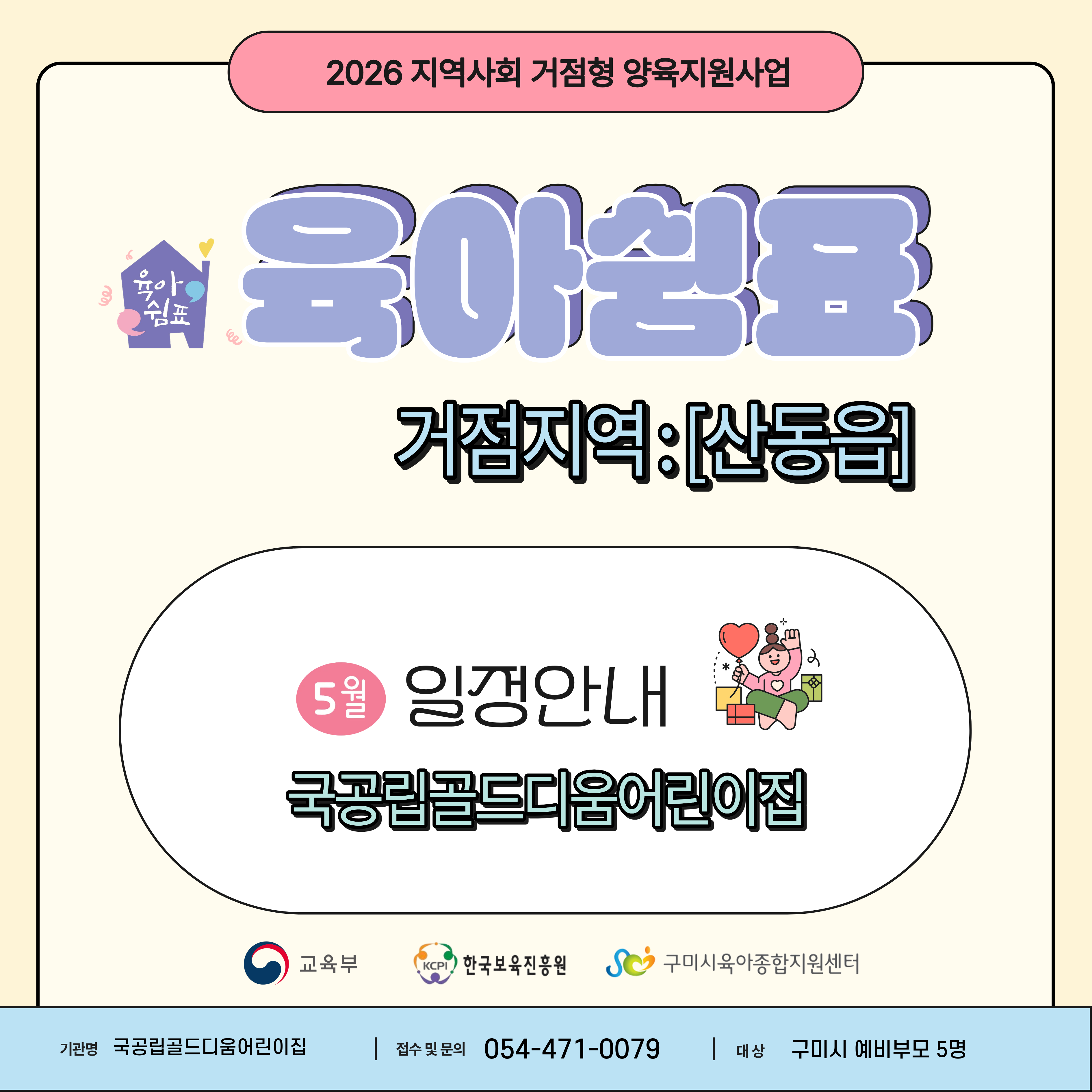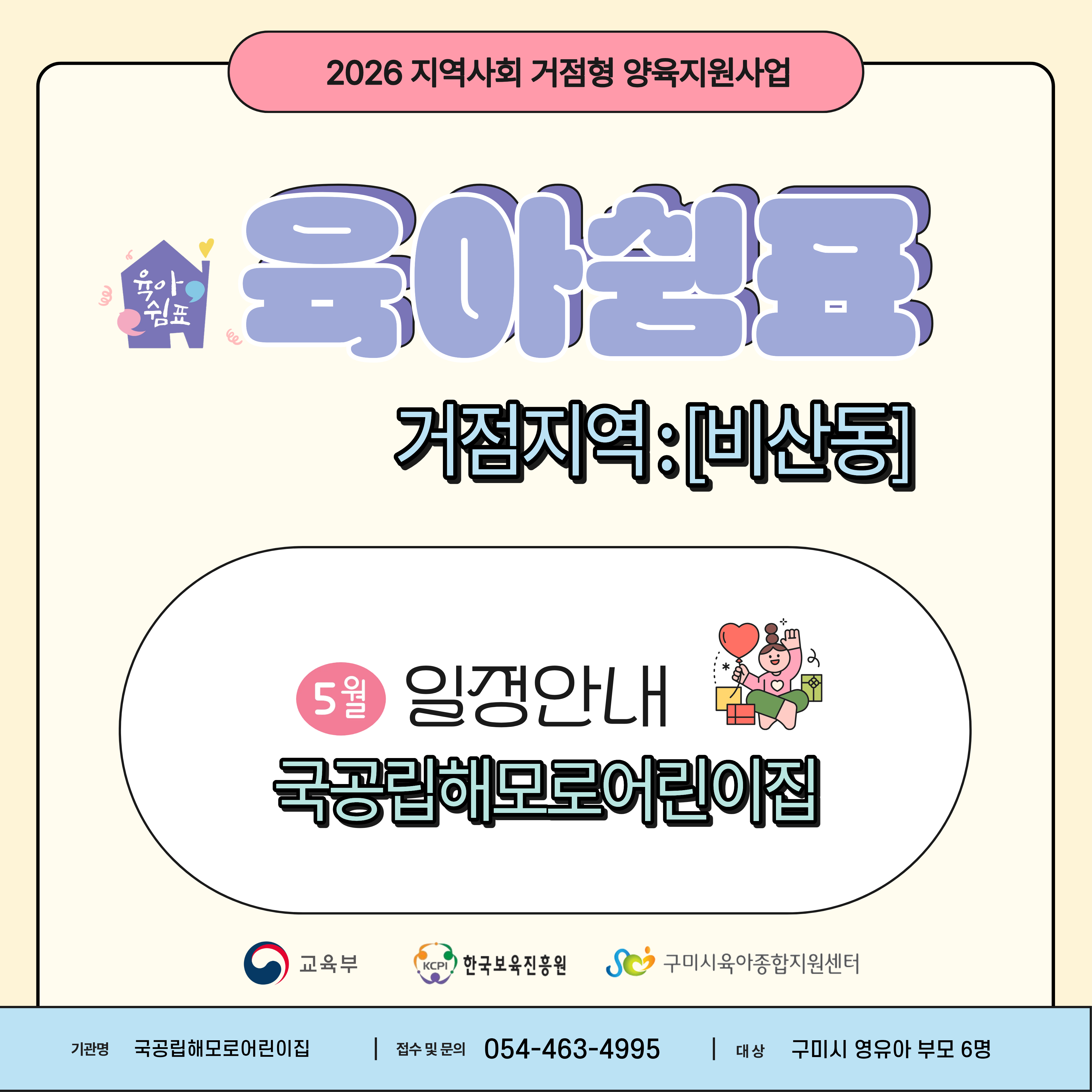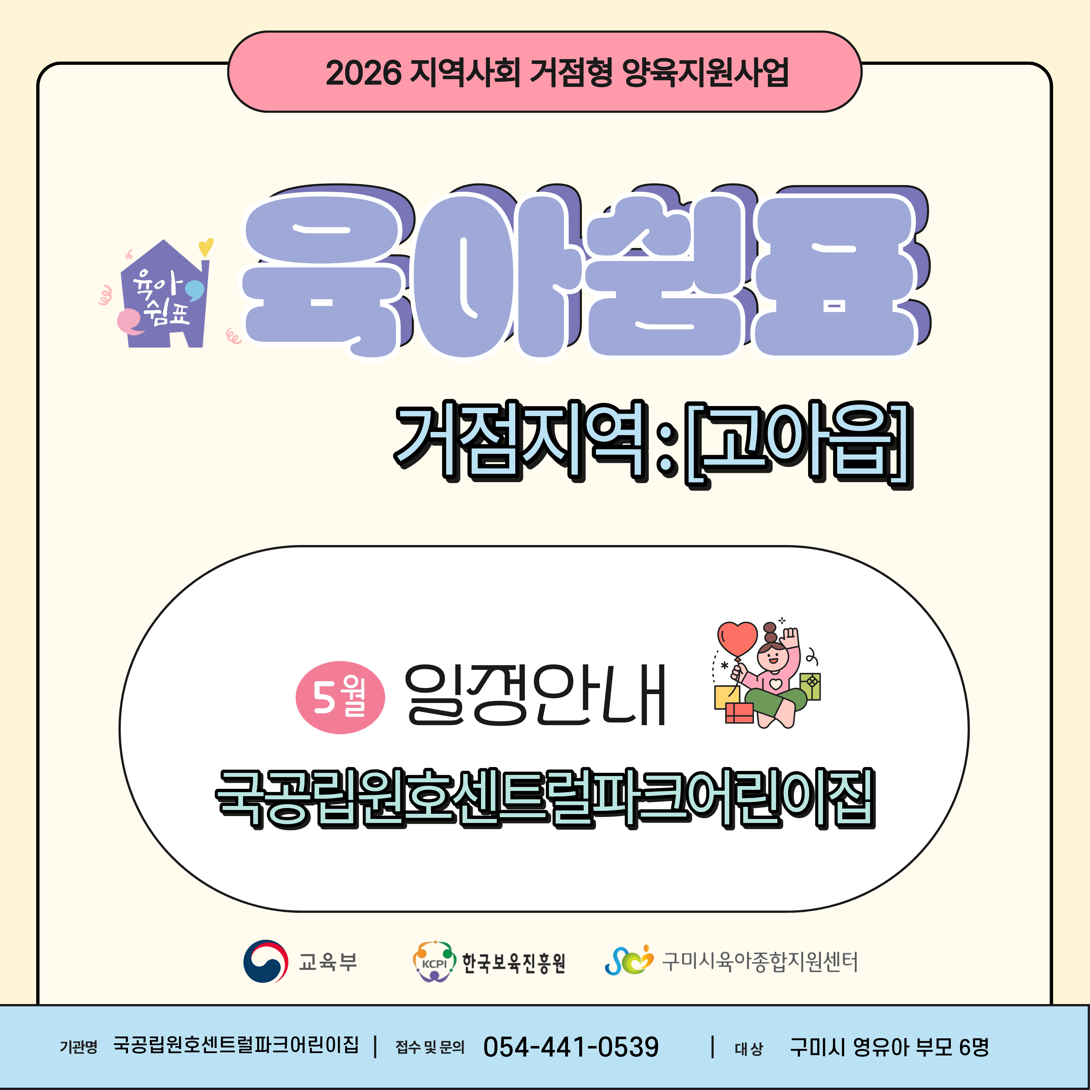 안녕하십니까? 구미시육아종합지원센터입니다. 2026년 지역사회 거점형 양육지원사업 【육아쉼표】 5월 신청 안내입니다. ■ 사업일시 : 2026. 5. ■ 사업내용 : 부모교육 및 자조모임 ■ 신청 : 5월 일정안내 참고 ■ 신청방법 : 해당거점어린이집 전화접수 ■ 신청순위 : 1) 1순위 : 가정양육 부모 및 영유아 2) 2순위 : 해당 거점 어린이집 외 타 어린이집 재원 영유아 및 부모 3) 3순위 : 해당 거점 어린이집 재원 영유아 및 부모 ■ 유의 : 1) 신청 기간 확인 후 신청 부탁드립니다. 2) 교육 취소 및 변경 시 사전 연락 부탁드립니다. ▶ 자세한 교육 일정 및 내용은 첨부 된 안내문을 참고해주세요. 많은 관심과 참여 부탁드립니다. 감사합니다. 담당 054-474-2017 (내선6) |