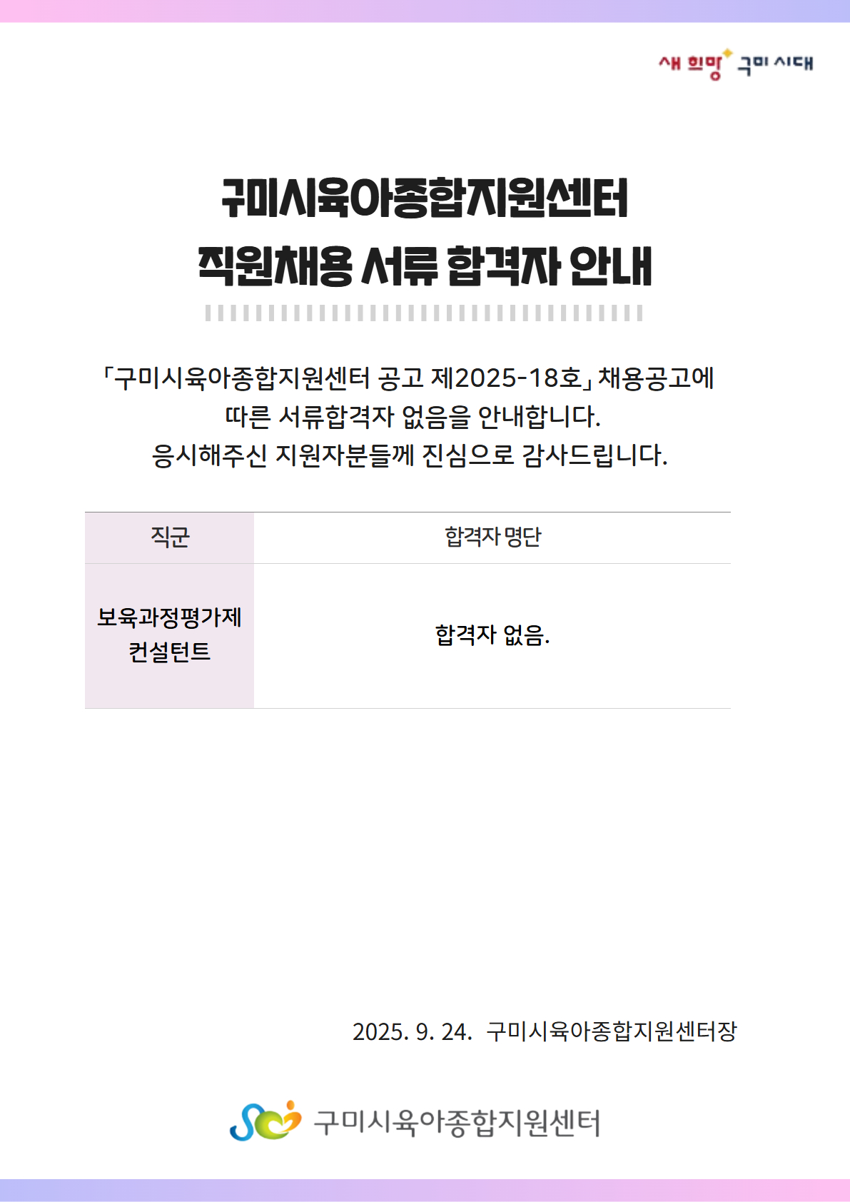 | [구미시육아종합지원센터 공고 제2025-18호] 구미시육아종합지원센터 직원(보육과정 평가제 비상근 컨설턴트) 서류합격자 발표 | |||