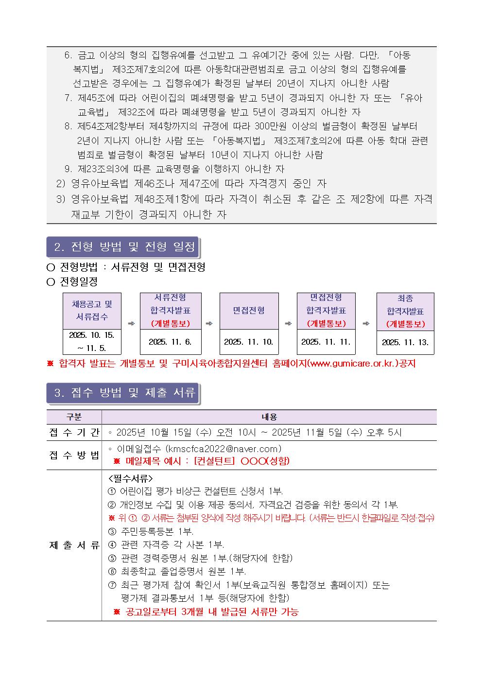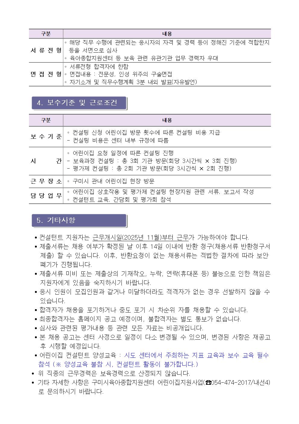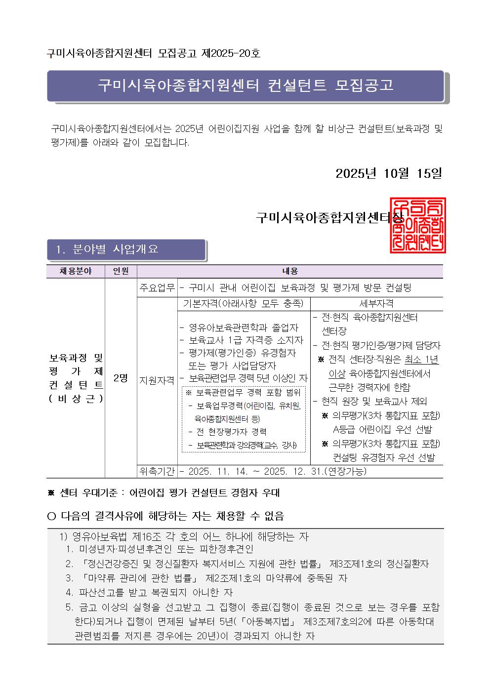 [구미시육아종합지원센터 공고 제2025-20호] 구미시육아종합지원센터 보육과정 및 평가제 비상근 컨설턴트 채용 공고 | |||
