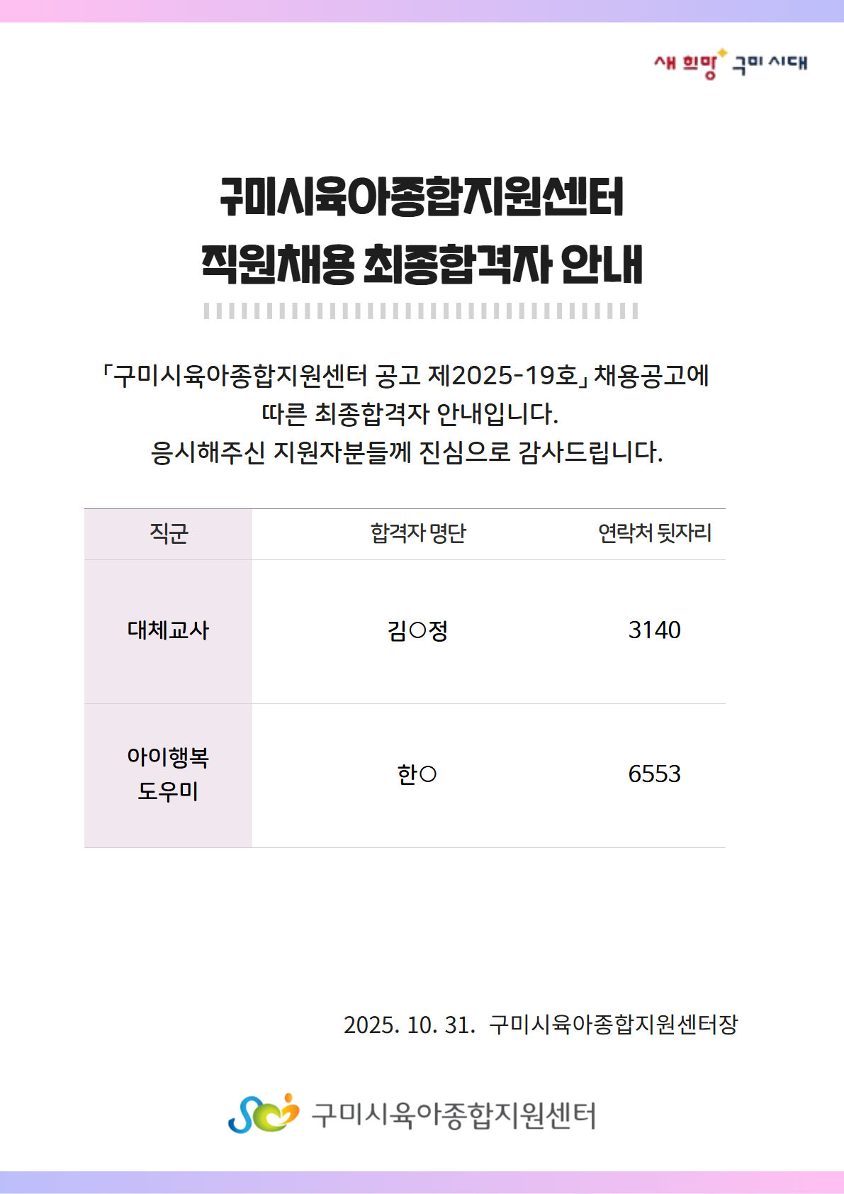 | [구미시육아종합지원센터 공고 제2025-19호] 구미시육아종합지원센터 직원(대체교사, 아이행복도우미) 최종합격자 발표 | |||