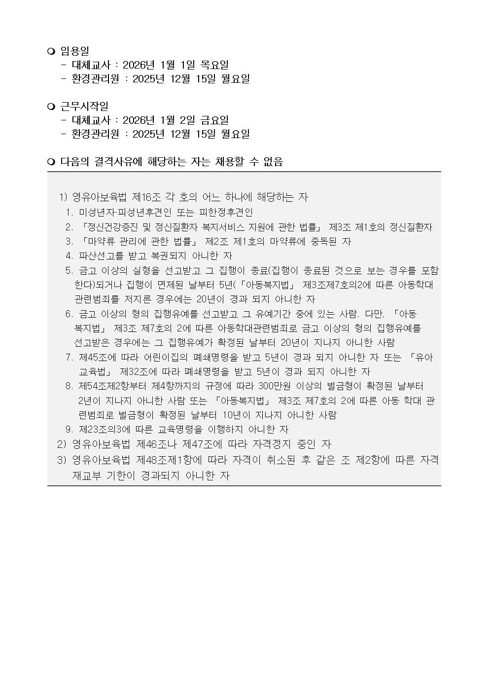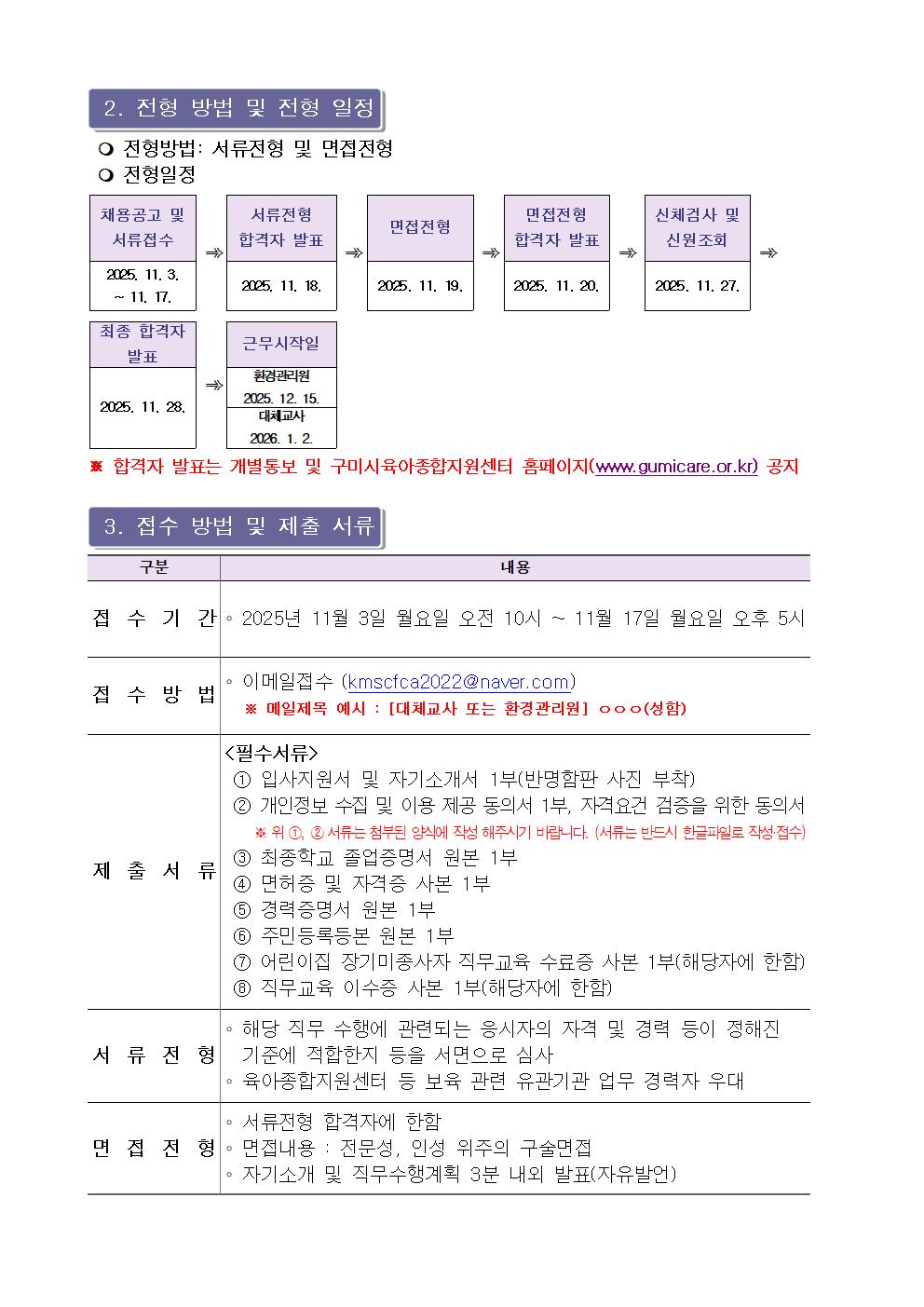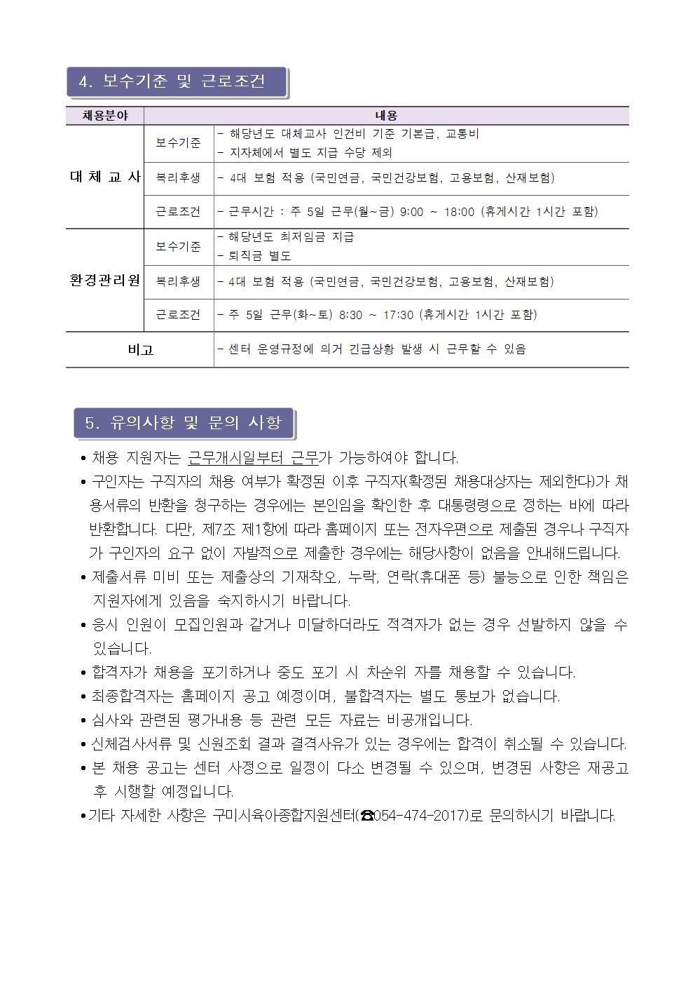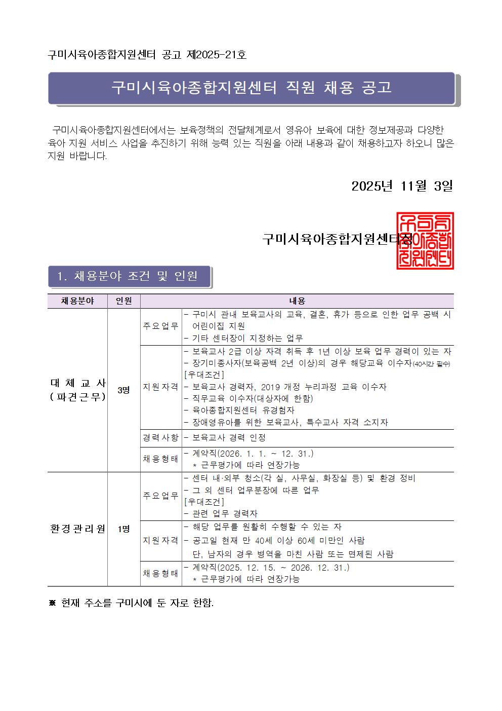 | [구미시육아종합지원센터 공고 제2025-21호] 구미시육아종합지원센터 직원(대체교사, 환경관리원) 채용공고 | |||