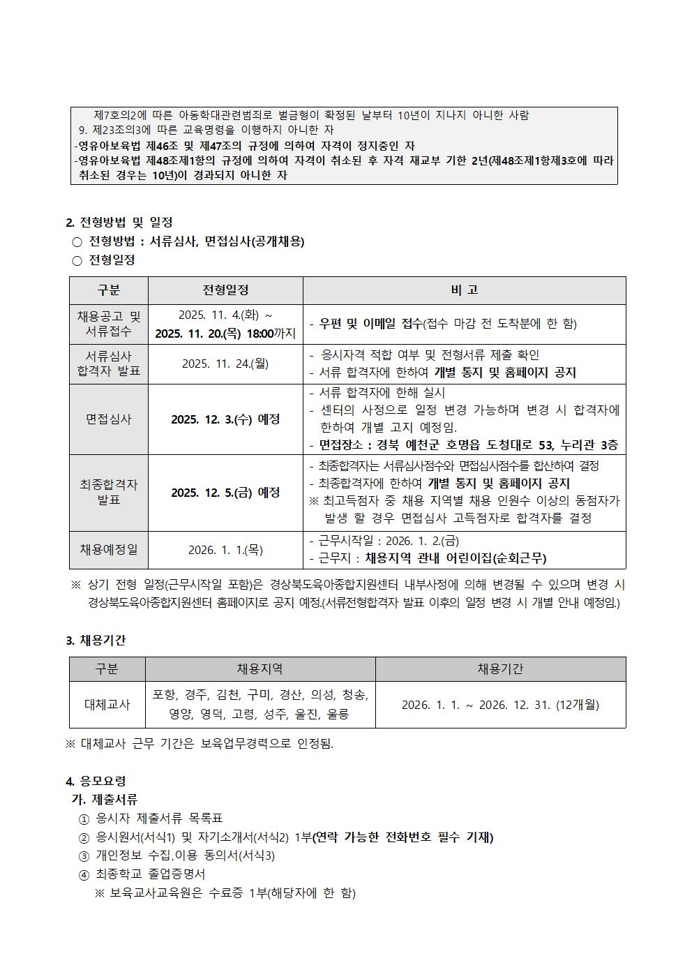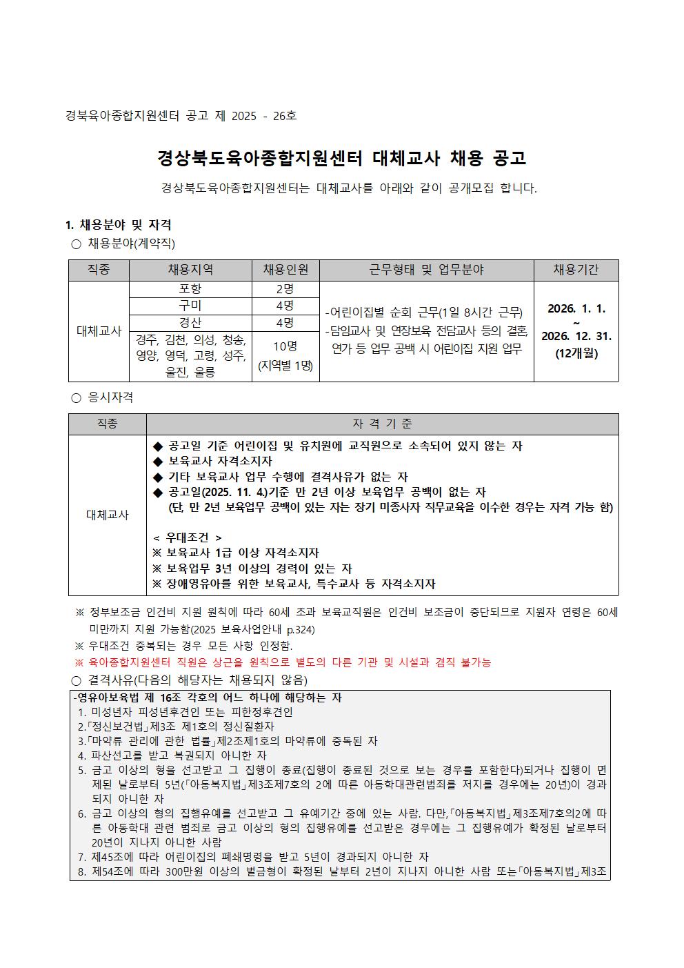 | [경북육아종합지원센터 공고 제2025-26호] 경상북도육아종합지원센터 대체교사 채용 공고 | |||