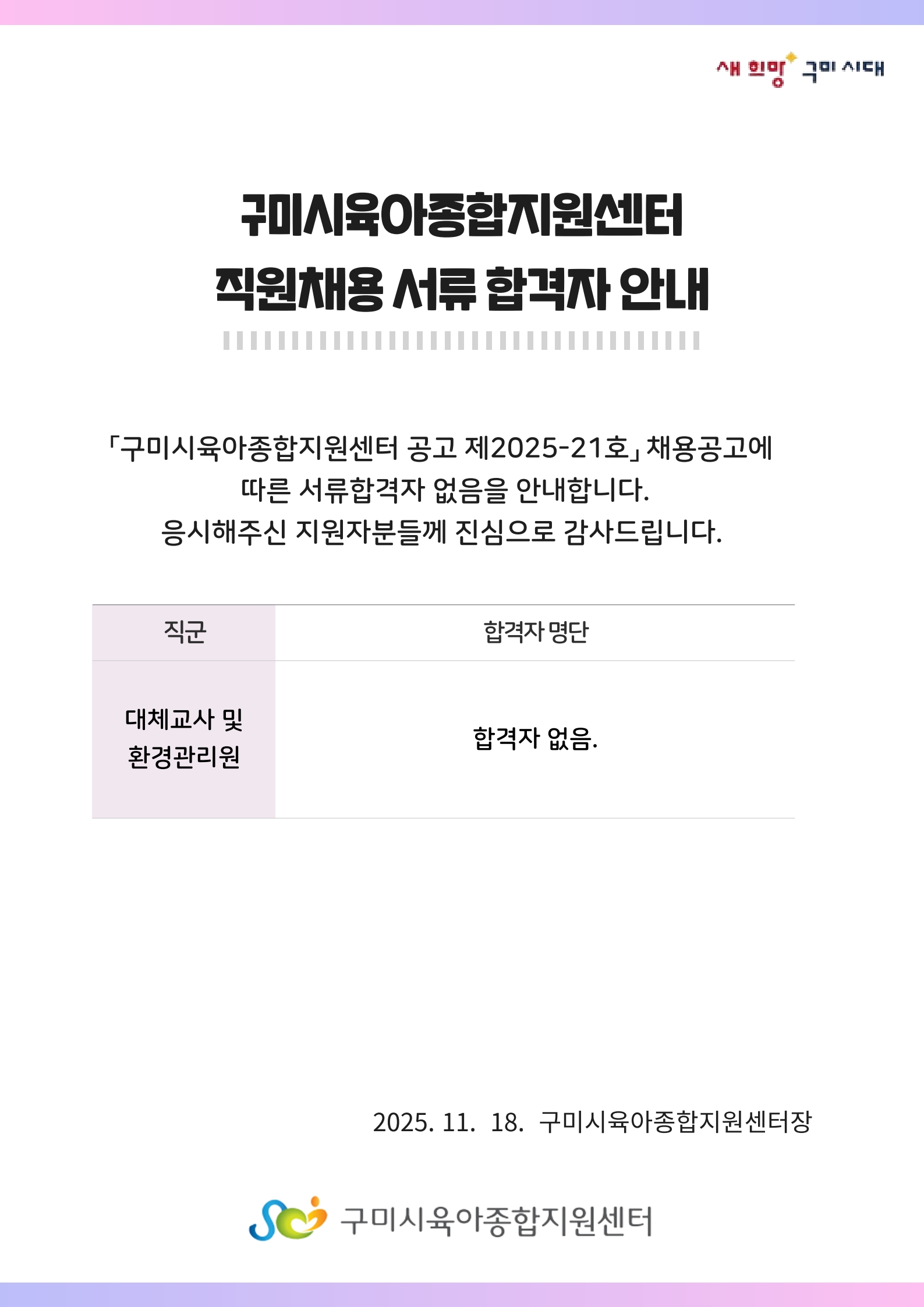 | [구미시육아종합지원센터 공고 제2025-21호] 구미시육아종합지원센터 직원(대체교사, 환경관리원) 합격자 발표 | |||