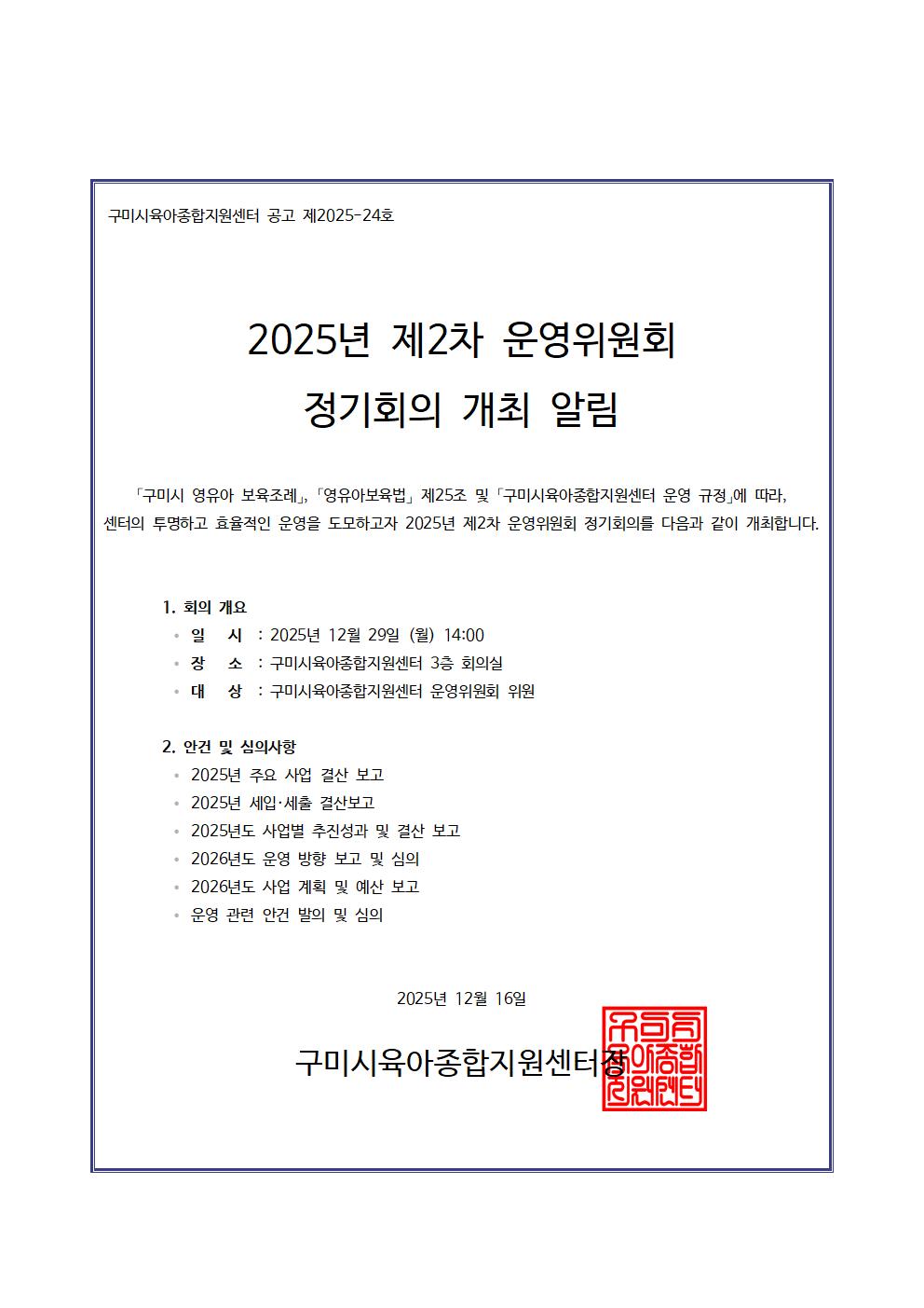 [구미시육아종합지원센터 공고 제2025-24호] 2025년 제2차 운영위원회 정기회의 개최 알림