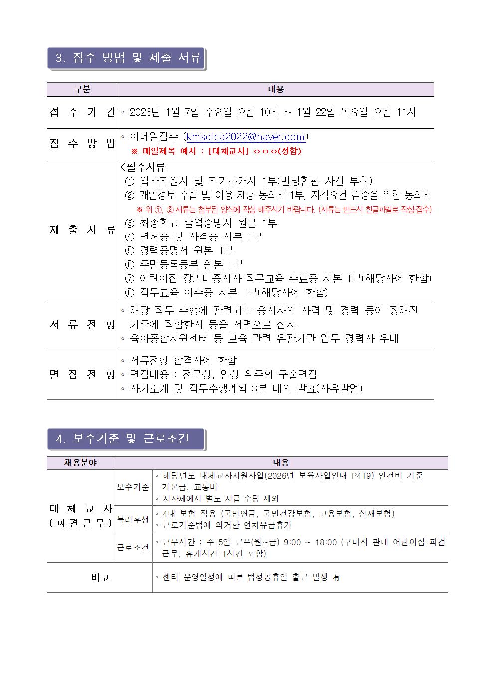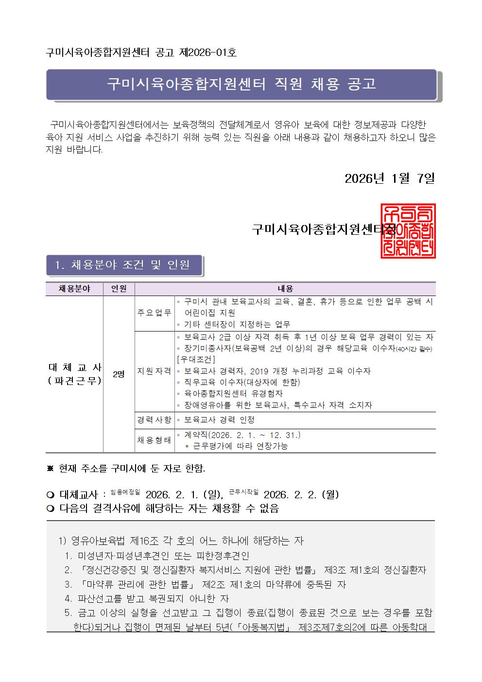| [구미시육아종합지원센터 공고 제2026-01호] 구미시육아종합지원센터 직원(대체교사) 채용공고 | |||