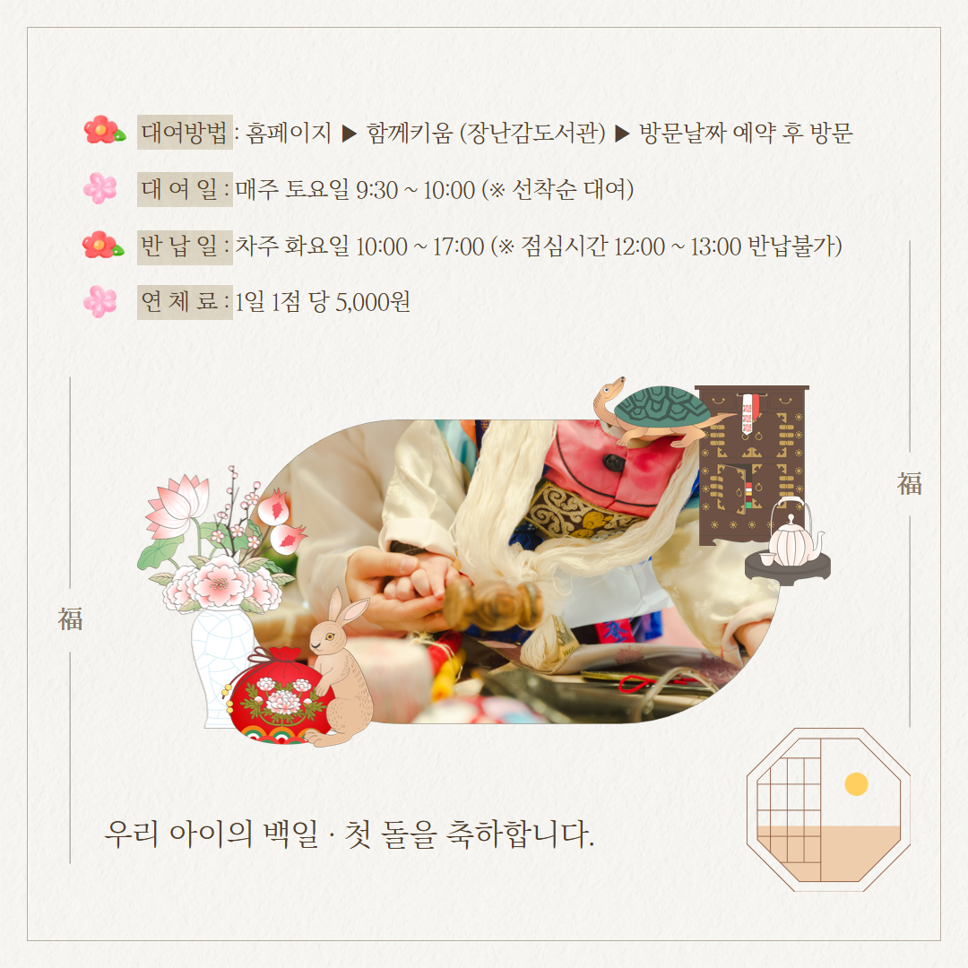 장난감도서관에 백일 및 돌 한복이 추가로 비치되었습니다. 대여는 2/7(토)부터 가능하오니 많은 관심 부탁드립니다.^^*