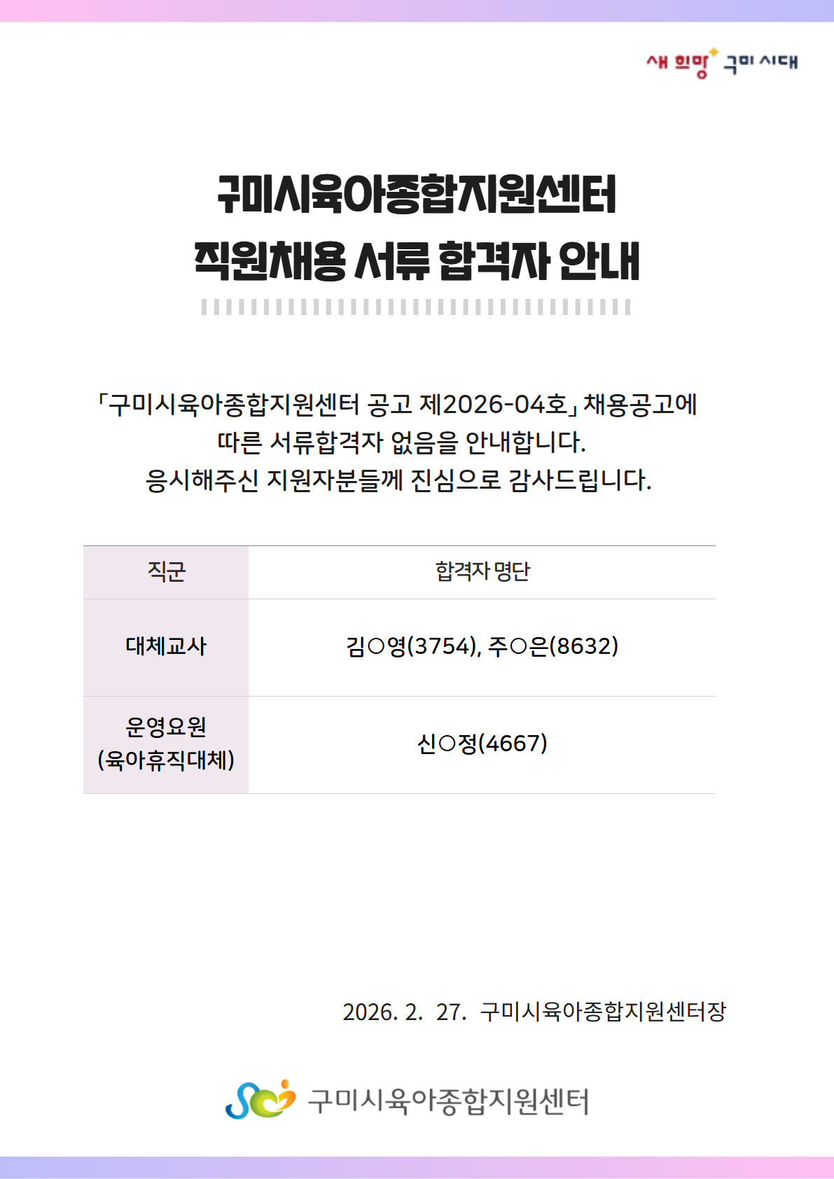 | [구미시육아종합지원센터 공고 제2026-04호] 구미시육아종합지원센터 직원(운영요원, 대체교사) 최종합격자 발표 | |||