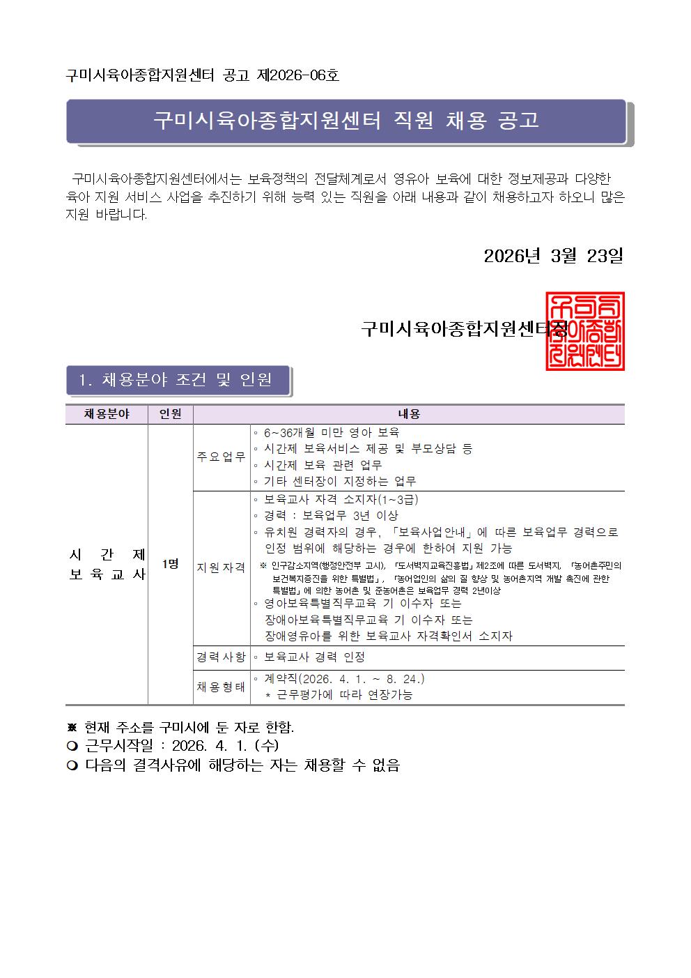 | [구미시육아종합지원센터 공고 제2026-06호] 구미시육아종합지원센터 직원(시간제 보육교사(육아휴직대체)) 채용공고 | |||