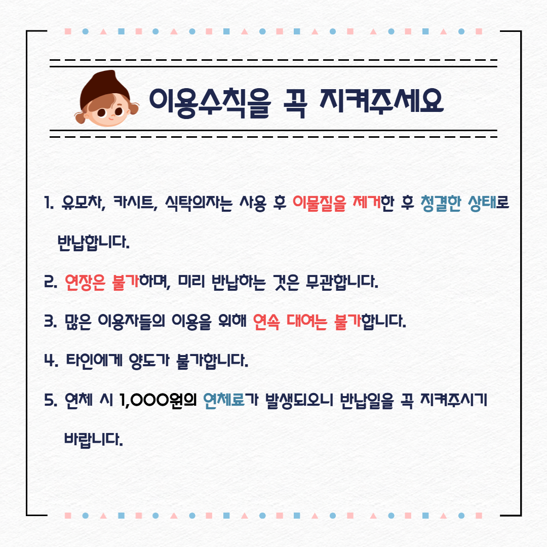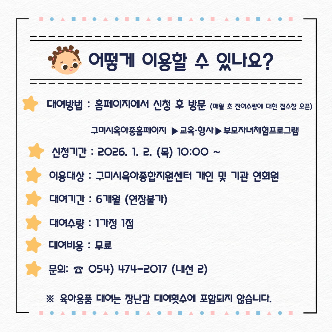 유의사항◆ 신청 완료 후 1F 장난감도서관으로 오셔서 물품을 대여하시기 바랍니다. - 신청 일로 부터 5일 이내 수령하지 않은 경우 자동 취소 됩니다. ◆ 후보 인원은 순번에 따라 개별적으로 연락을 드립니다. ◆ 운영 시간: - 화~금 10:00 ~ 17:00 - 토요일 10:00 ~ 16:00 - 점심시간 대여·반납 불가 12:00 ~ 13:00 ※ 일, 월요일은 휴관 입니다. ◆ 매월 첫 주 잔여 수량에 대한 접수창이 업로드 됩니다. ◆ 문의 사항은 아래 번호로 전화 주시기 바랍니다. ☎ 054) 474-2017 (내선번호 2) |