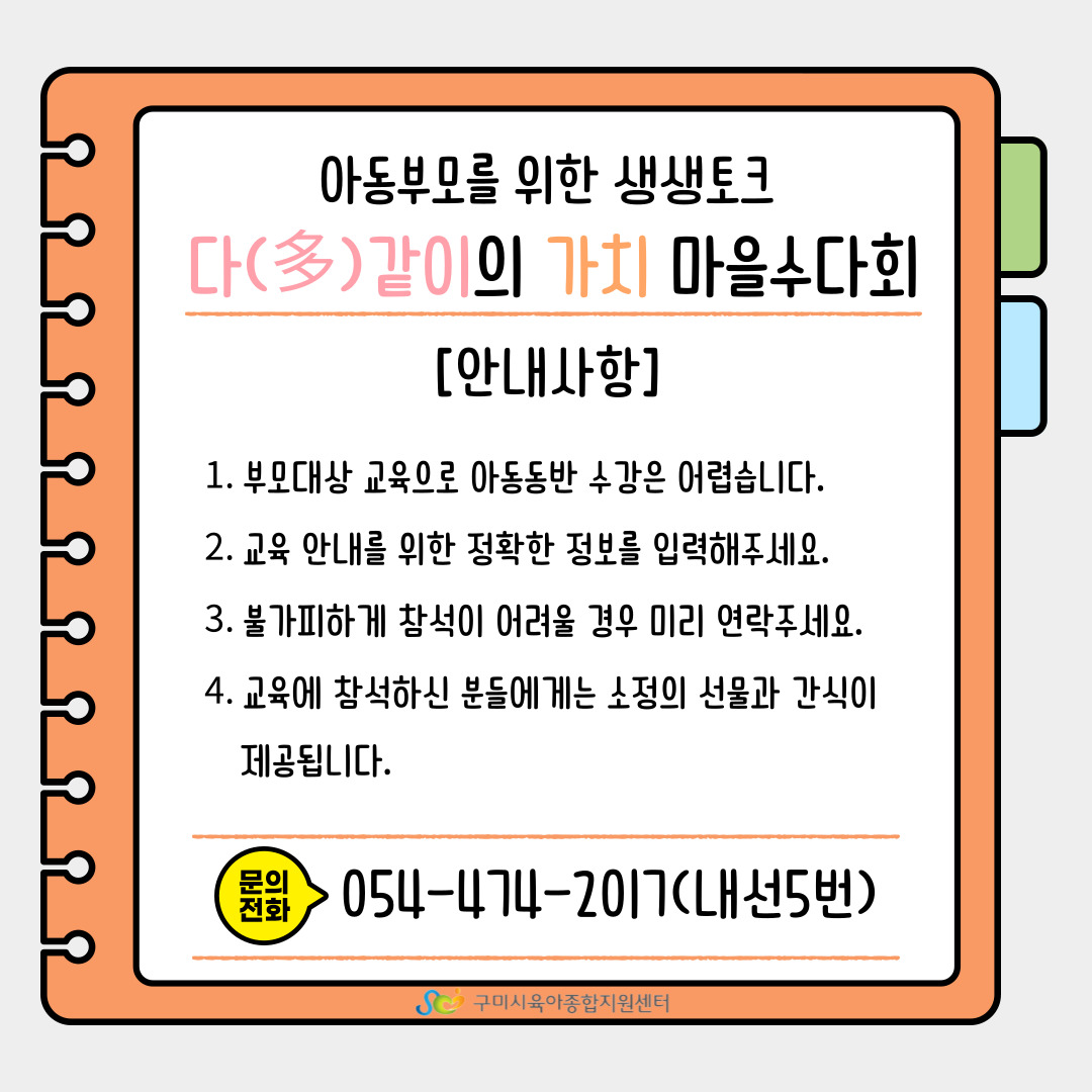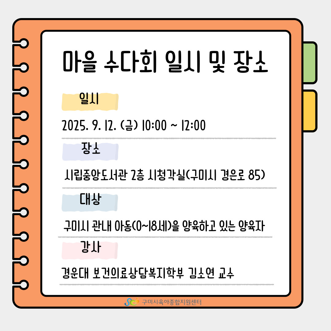 | 대상 | [개인+기관] [일반회원] 구미시 관내 아동(0-18세) 양육하는 양육자 | 강사명 | 경운대 보건의료상담복지학부 김소연 교수 |